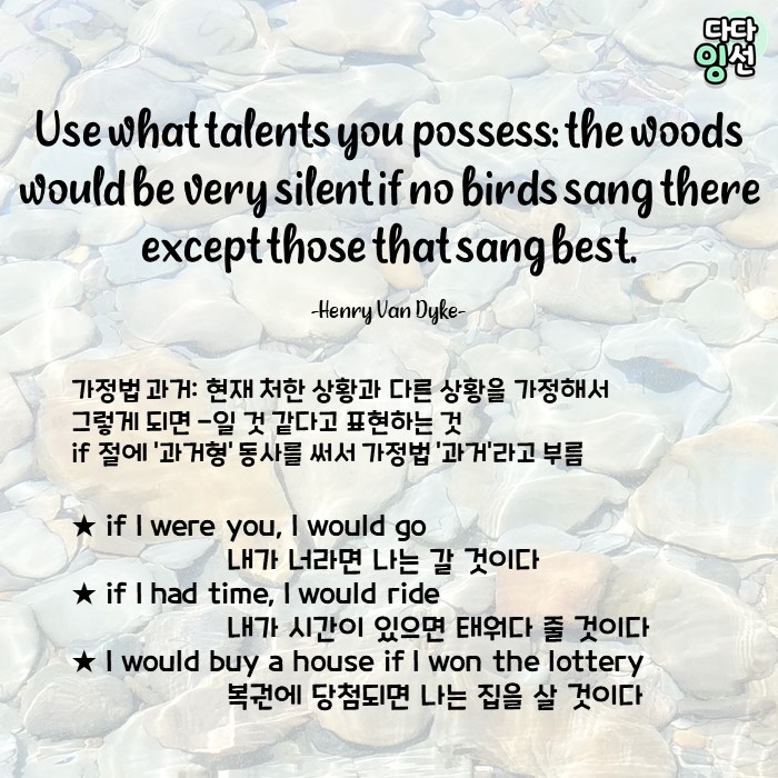 우리나라에서 문법을 배우다 보면 가정법 과거, 가정법 과거완료라는 말을 꼭 듣게 돼요. 오늘 명언에는 이 중에서 가정법 과거가 등장했기 때문에 요 문법에 대해서 알아보도록 할게요. 기본적으로 가정법 과거는