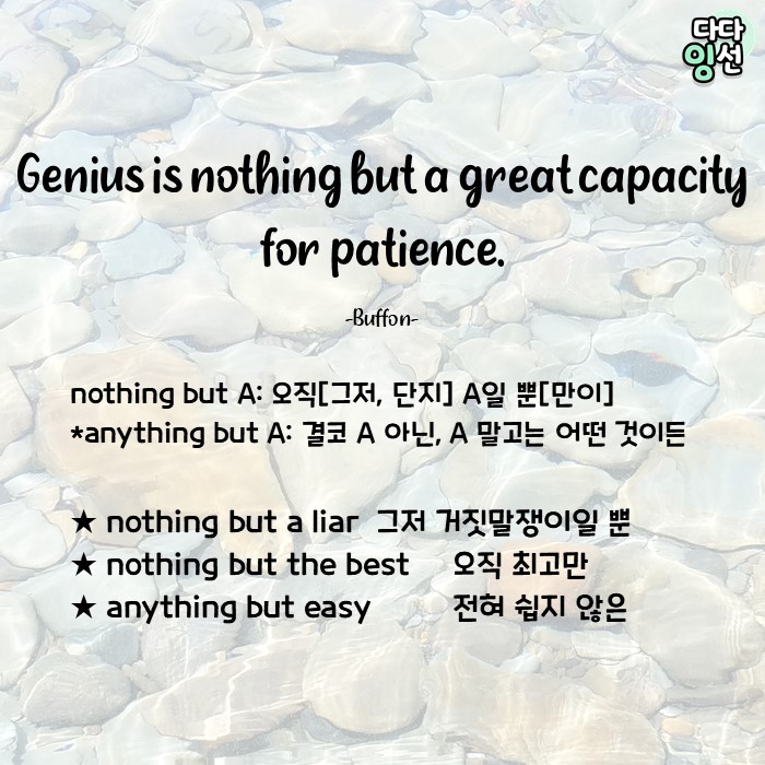 nothing 은 단독으로 쓰일 땐 '아무것도 없는, 별 것 아닌 것'과 같은 의미로 쓰여요. 그리고 but 은 보통 '그러나, 그런데'라는 의미를 나타내는 접속사로 많이들 알고 계실 거예요. 그런데 but 이 전치사로도 쓰인다는 것 알고 계셨나요? 이럴 땐 except 와 비슷하게 '-이외에'라는 의미를 가진답니다. 그렇게 nothing 과 전치사 but 이 합쳐져서 nothing but 이 만들어졌어요. 둘의 뜻을 조합해보면 의미를 쉽게 유추할 수 있는데요, A를 제외하면 아무것도 아닌 것이 되니 '오직 A 뿐, 그저 A만'이라고 다듬어 볼 수 있겠네요.